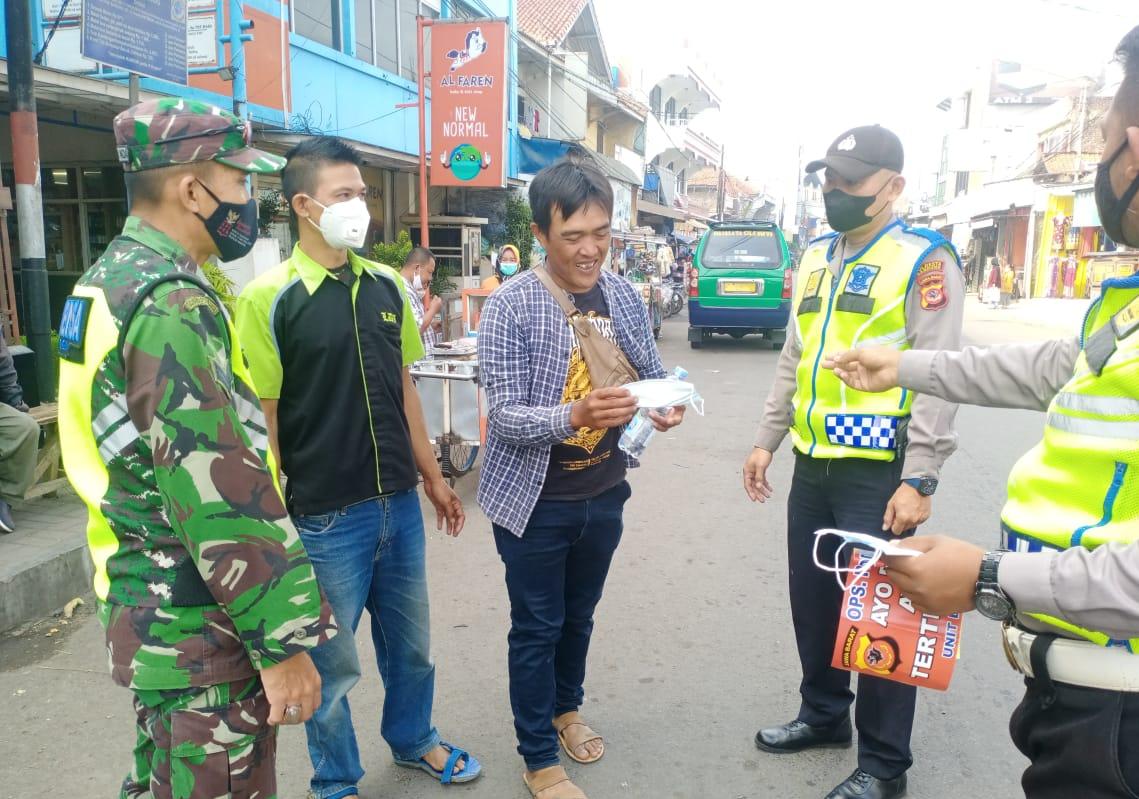 Polsek dan Koramil Rancaekek membagikan masker secara gratis kepada warga di Pasar Dangdeur Kec. Rancaekek, Sabtu (25/09/2021).